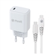 Pack muvit for Change que incluye un cargador de pared con clavija europea de un elegante diseño patentado. Está fabricado con material reciclado y pensado en 2 piezas para facilitar su reciclaje al final de su vida útil. Dispone de 1 puerto tipo C PD de 20W de potencia más un cable para carga y transferencia de datos con conector Tipo C a Tipo C 3A, 1m de longitud, en color negro y 100% reciclable.